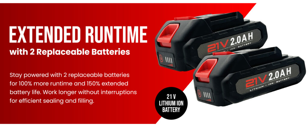 - ✔️ Includes 2 Replaceable 21V Batteries: Ensure reliable backup power for extended operation on your caulk gun with two 21V batteries. With two batteries, you can double your working time, reduce wear on each battery, and extend their lifespan for more efficient performance during large-scale projects.